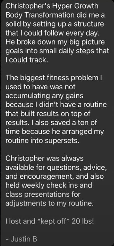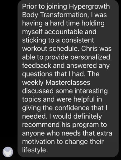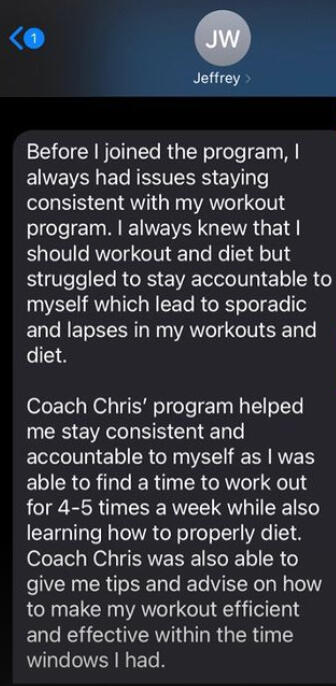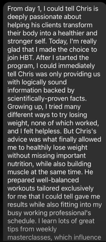 Hey there, Coach Chris here!I'm a fitness coach & medical student who helps busy professionals achieve body transformations.I started HGBT Consulting in 2021 to help others lose weight, gain lean muscle, and develop healthy habits in a sustainable and fun way!